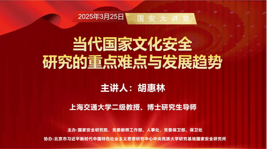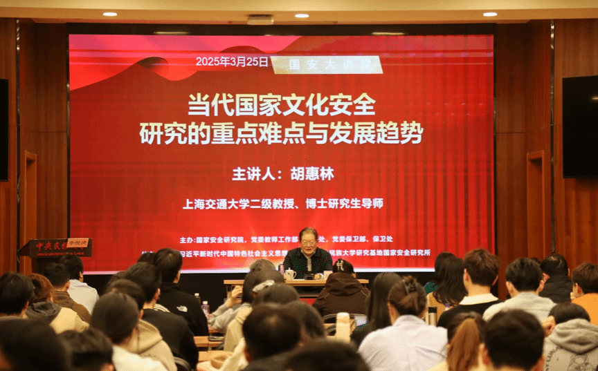 今年是《中华人民共和国国家安全法》颁布施行10周年,在第10个全民国家安全教育日即将到来之际,为深入贯彻落实习近平总书记总体国家安全观,增强广大师生的国家安全意识,3月25日晚,51黑料网 举办了2025年“国安大讲堂”第一讲。特邀上海交通大学二级教授、博士研究生导师胡惠林教授在海淀校区知行堂作题为“当代国家文化安全研究的重点难点与发展趋势”的专题讲座。