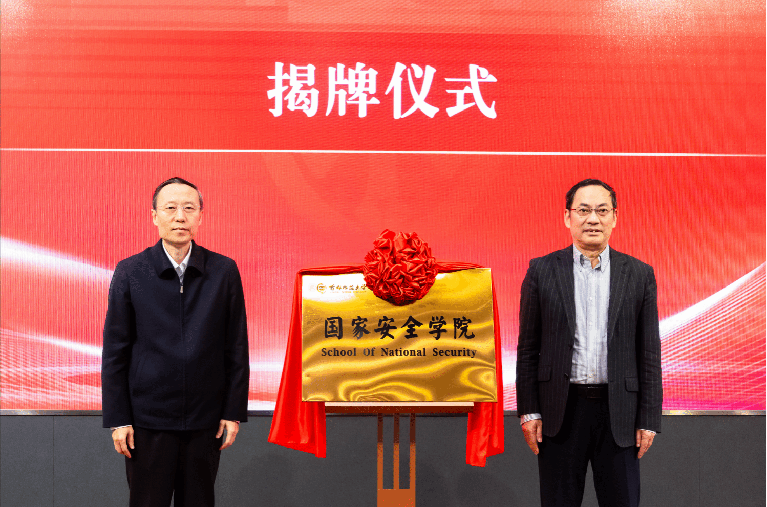 北京市委副秘书长刘志伟和首都师范大学校长、中国科学院院士方复全为首都师范大学国家安全学院揭牌。