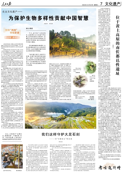 12月24日,《人民日报》第7版“文化遗产”专栏发表龙春林署名文章《为保护生物多样性贡献中国智慧》,文章详细介绍了龙春林团队以云南红河哈尼稻作梯田系统为对象开展研究,揭示其生态系统服务功能的研究结果。团队通过实地调研获得大量一手资料,反映了云南红河哈尼梯田、河北涉县旱作梯田等文化遗产地的生物多样性状况,彰显我国先民的智慧——在保护农业生物多样的同时,也在持续地贡献于自然生态系统的保护和修复、生态安全体系的构建,体现了我国不同民族长期保护和利用生物多样性的可持续性实践,是“人与自然和谐共生”的典型代表,是中华民族贡献给世界的中国智慧和中国方案。