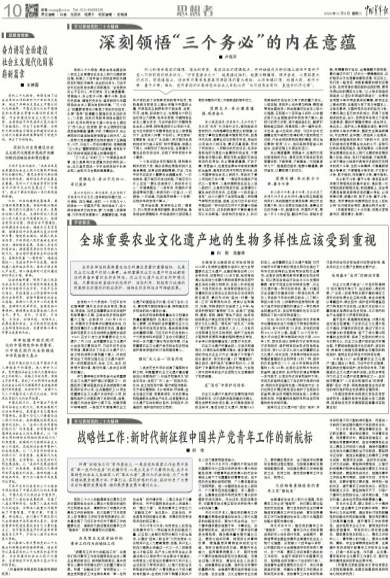 11月8日,《中国青年报》第10版“思想者”栏目刊登《重要农业文化遗产地的生物多样性应受到保护》一文,龙春林在文中关注农业文化遗产地的生物多样性,提出在实践中要基于“人与自然和谐共生”的思想,兼顾“活态”传承,因地制宜地推进生物多样性的有效保护和生物资源的合理利用,确保农业生态系统的安全和可持续发展。