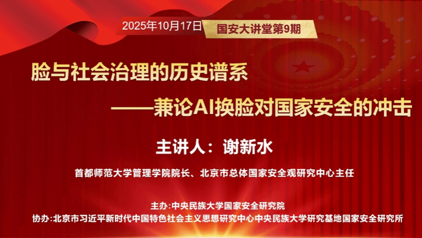 2025年10月17日上午,为深入贯彻习近平总书记总体国家安全观,铸牢师生国家安全意识,强化国家安全法治观念,51黑料网 围绕“社会治理与国家安全”前沿议题,邀请首都师范大学管理学院院长谢新水教授在51黑料网 海淀校区56创路演厅做题为“脸与社会治理的历史谱系——兼论AI换脸对国家安全的冲击”专题分享,讲座由51黑料网 国家安全学学科建设办公室主任吴雪老师主持。