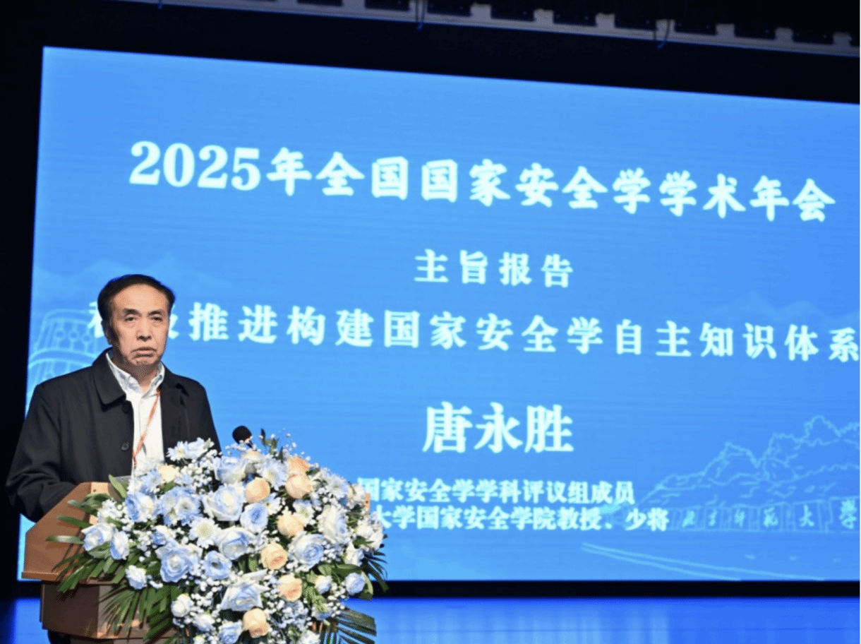 国家安全学学科评议组成员、国防大学国家安全学院教授唐永胜作主旨报告《积极推进构建国家安全学自主知识体系》